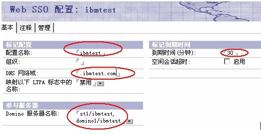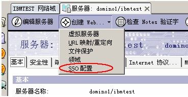 打开domino1/ibmtest服务器文档,选择“基本”->“创建Web…”->“SSO配置”,具体步骤如图10所示,如下: