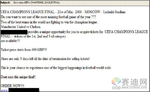 2008年5月21日在莫斯科举行了最为瞩目的欧洲足球赛事,该赛事的门票也受到了全欧洲的热捧,当然垃圾邮件发送者也不会无动于衷。