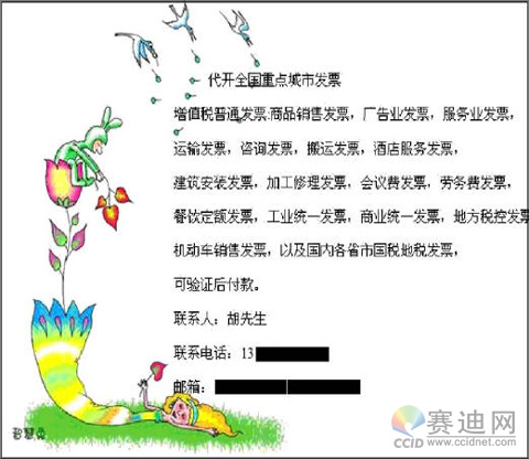 以逃税为目的的非法发票是中文中最常见的垃圾邮件之一。中华人民共和国公安部的一份声明显示,2007年中国警方破获发行或销售假发票的案件2963起,拘留嫌疑人1917人,没收假发票1051万张,捣毁假发票印制操作101次。