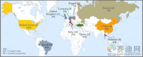 来源地区指过去30天内来自特定国家和地区的垃圾邮件比例。