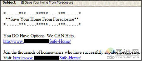 一些垃圾邮件发送者试图利用避免赎回权被取消的补救措施来“帮助”业主减轻抵押贷款义务以及避免信用等级受损的负面影响。下例中,垃圾邮件发送者要求终端用户访问一个网站并在表格中填写邮寄地址、电话、抵押贷款余额等信息。用户点击提交按钮后,会出现确认消息,注明他们的代表会就贷款问题与用户取得联系。