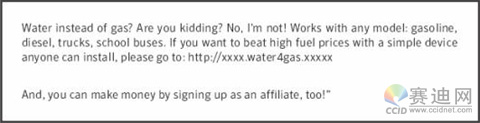 低迷的房地产市场并非垃圾邮件的唯一的目标。随着燃料价格的上涨,赛门铁克观察到与汽油/燃料相关的垃圾邮件数量激增。比如,这些邮件声称提供免费的汽油或汽油充值卡和产品,可以实现每加仑行驶更远的距离,从而降低总体的汽油消费。在新近的例子中,垃圾邮件发送者声称只要拥有一个特殊的装置,收件人可以使用水替代汽油作为车辆的燃料,以对抗高油价压力。
