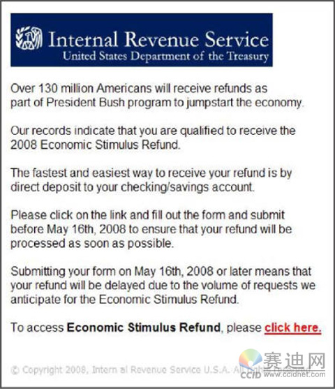 过去几个月中,美国政府的经济刺激方案覆盖范围越来越广,由此,赛门铁克也观察到一些垃圾邮件发送者向纳税人发送有关刺激性方案的钓鱼攻击邮件,其中包含刺激性方案的简要介绍(与美国国税局邮件的措辞十分类似)。之后垃圾邮件发送者会请求收件人提交个人信息。邮件中会特别强调如果用户不在规定期限内提交个人信息,退税就会被延迟。