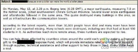 最近的地震捐款邮件骗局要求人们为中国地震受难者捐款。设计者在合法网站的根域下面插入一个欺诈性页面。用户只要点击垃圾信息中包含的网址,就会进入一个欺诈性网站并被要求捐款。