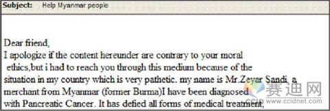 面对近来的缅甸飓风和中国地震,世界各地的政府和个人纷纷向受灾地区伸出援助之手。可以预见,人们的慷慨解囊不会逃过垃圾邮件发送者的注意。最近几个星期以来,与上述灾害相关的垃圾邮件频频现身。