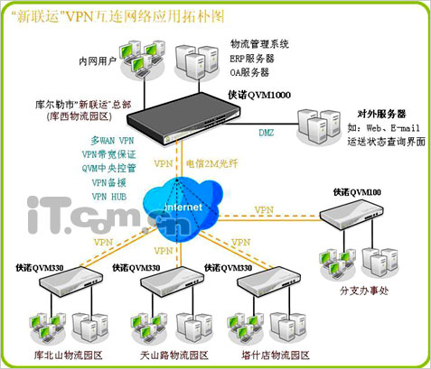 总部中心端:库尔勒市公司库西物流园区的总部中心端,采用Qno侠诺QVM1000 VPN防火墙,做为企业总部数据中心端接入设备,可支持PPTP、IPSec VPN、SmartLink VPN、QnoKey IPSec客户端密钥等连机方式,可满足外点多种VPN弹性配置需求,实现总部中心端与各分点建构实时、稳定、安全的互连VPN网络系统。