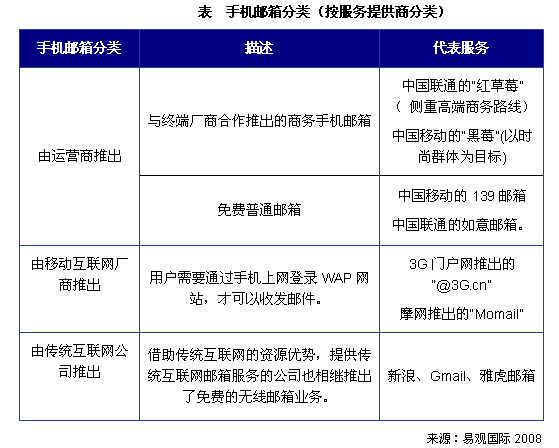 2007年,中国移动运营商、移动互联网厂商、传统互联网厂商先后推出免费邮箱服务。易观国际认为,对于中国移动大力推广其免费手机邮箱服务,以统一手机号为纽带,将手机变为用户随身的个人综合信息平台,由此再提供更多产品、内容和服务,增加用户黏性是其大力推广免费手机邮箱的真正动机。对于无线厂商,通过提供手机邮箱服务丰富应用服务。对于传统互联网厂商,通过推出手机邮箱服务,主要是卡位手机邮箱市场,同时为其互联网邮箱用户提供另一种使用方式。
