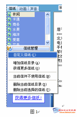 除此之外,koomail还允许用户自己设计制作信纸模板。在这里让我们先打开koomail的写信窗口,在左侧单击信纸管理,出现“自定义信纸”、“增加信纸目录”等。如图1所示。如果我们想设计一个自己的信纸模板,在这里你可以根据信纸模板的特点选择不同的分类,如果你设计的这个信纸模板想放在“卡通”分类里,则需要你首先选中卡通分类,再执行自定义信纸功能,如果想新建一个分类,则可以通过点击“增加信纸目录”来创建,输入你想设置的分类名称即可,如图2所示。