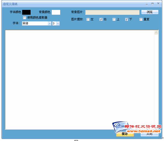 在此操作功能界面里我们就可以根据自己的喜好动手设计属于自己的信纸模板了。在这里可以改变字体颜色、和背景颜色,也可以通过背景图片插入自己喜欢的图片。并可以通过图片位置来调整你所插入的图片位置。