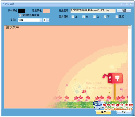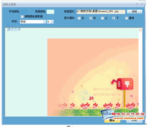 这时我们发现,图片是插入了,可是和背景颜色不融合,很难看,那怎么办呢?没有关系,koomail提供的这个信纸模板制作功能很强大。我们可以通过背景颜色来设置,出现如图5的对话框,在这里设置好色值即可。