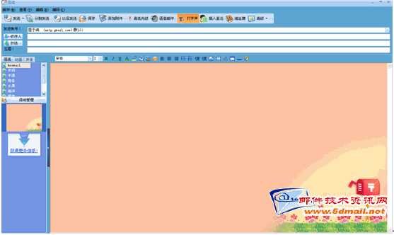 对于哪些喜爱漂亮信纸模板的用户来说,Koomail 5.0为大家带来了福音,5.0版中新增加了信纸模板,表情动画、插入背景音乐等非常漂亮好用的功能,可以让你轻松的撰写一封漂亮的多媒体邮件。