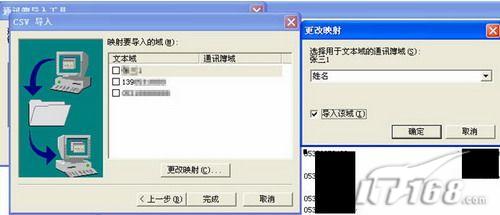文本域是你所保存的CSV文件中的第一栏的人名和电话号码,通讯薄域是outlook express中应该对应的位置,这个时候选择“更改映射”,弹出新的对话框,会分别让你选择你所保存的CSV文件中的内容所对应的outlook express中通讯薄的位置。记得选择完的时候把“导入该域”的对话框选上: