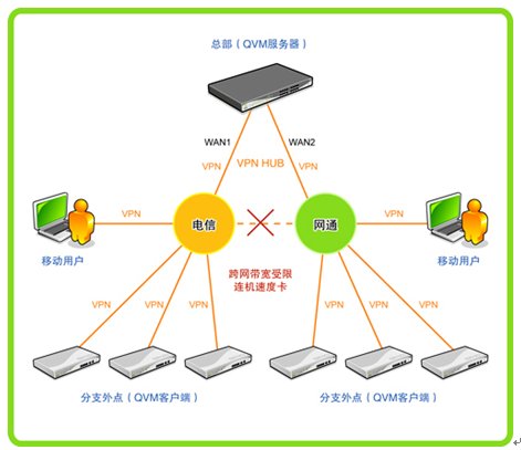 Qno侠诺VPN HUB功能,在分点与总部联通之后,即可利用总部中心点转发VPN信息,并自动切换不同运营商线路,既可节省成本,又可解决跨网VPN连机速度很卡的问题,轻轻松松便能实现分点间快速互连互通的目的。