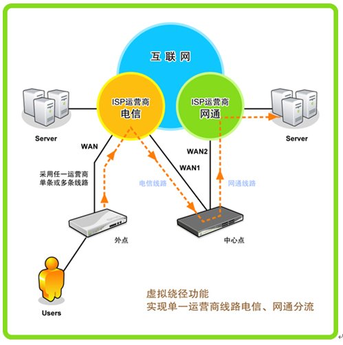 Qno侠诺虚拟绕径功能,可满足只能选择单一运营商线路接入的企业,实现电信、网通互连互通。上述策略路由功能解决跨网瓶颈,必须是同时具备电信、网通两种运营商线路接入的前提之下。但对于中国许多地区而言,企业通常只能选择接入单一运营商线路,又该如何解决跨网瓶颈?