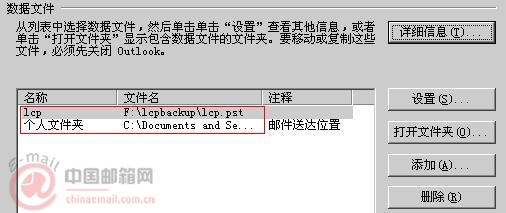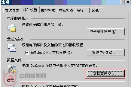 在安装之后,打outlook的工具->选项,选择”邮件设置”,点击”数据文件”(见图)