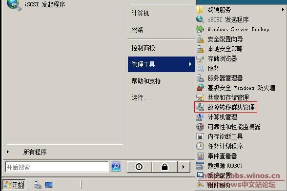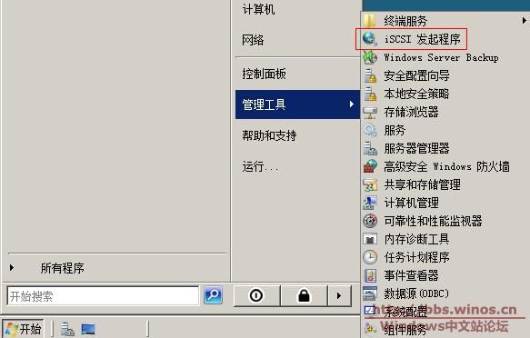 1.建域的过程就不在讨论了.直接把两台成员服务器加入域,点击"开始"菜单,"管理工具",打开"iSCSI发起程序"