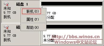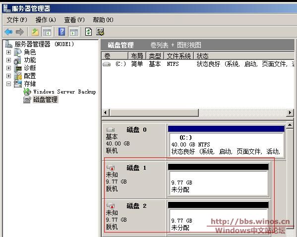 10.打开"服务器管理器",并点击"磁盘管理",可以看到多出来两个磁盘