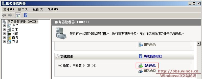 15.因为Windows Server 2008中故障转移群集默认是不被安装的.所以,打开"服务器管理器",选择"添加功能".