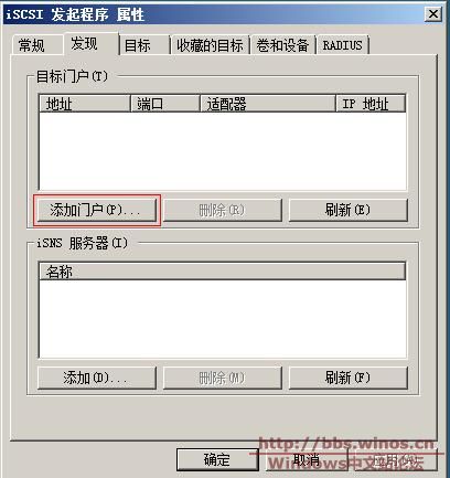 4.在打开的"iSCSI发起程度属性"对话框中选择"发现"选项卡,并点击"添加门户"以便用来添加iSCSI Target