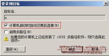 8.勾选"计算机启动时自动还原此连接",以便服务器重启时可以自动的连接