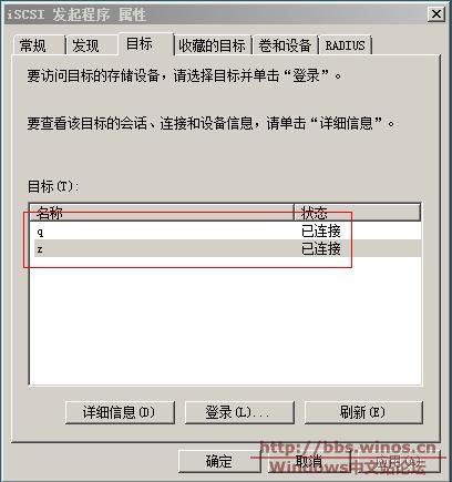 7.点击"目标"选项卡,可以看到下面有我在iSCSI服务器上创建的二个盘,一个为仲裁盘Q盘,一个为数据盘Z盘,由于状态为"不活动",因此点击"登录来激活目标.
