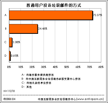 据中国互联网协会反垃圾邮件中心(www.anti-spam.cn)最新发布的2008年第一季度反垃圾邮件状况调查发现,普通用户在投诉垃圾邮件方式上,大多数都选择向邮件系统服务提供商投诉,持这一观点的用户比例为72.37%,较2007年第四季度50.95%的比例相比,增加了21.42个百分点;有24.48%的用户选择向中国互联网协会反垃圾邮件中心投诉。