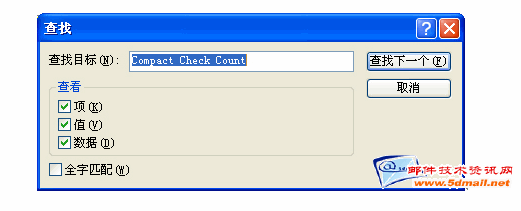 如上图,点击“确定”按钮,打开注册表,点击编辑》查找》输入查找目录内容: Compact Check Count