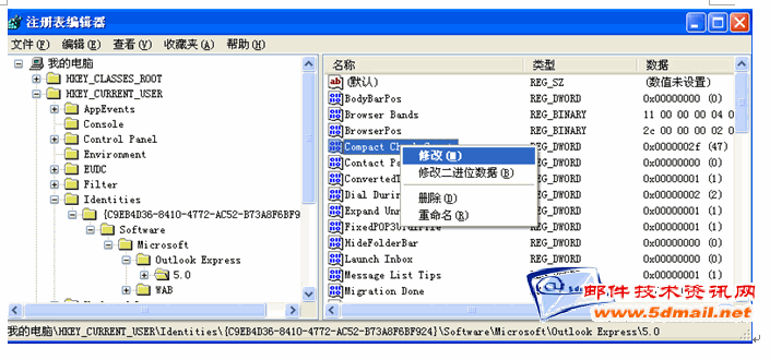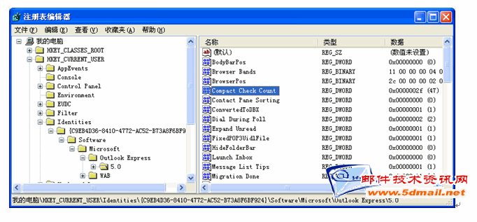 但你如果启动关闭几次OE,你会发现这个值在增加,它记录了OE启动关闭的次数,到100次以后又会出现压缩邮件的提示。到时候只需要再用此方法改回1就可以了。