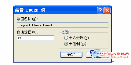 如上图,点击修改以后.选中十进制.将数值数据改为: 1 ,然后点击确定。重启电脑后,再次打开Outlook Express,执行关闭时就不会提示让您压缩邮件了。