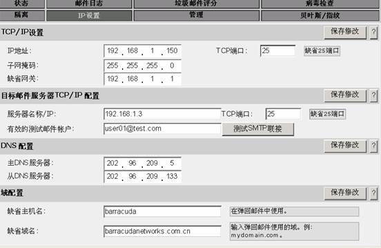 f 设置完毕请按保存键。注意,如果您修改了ip地址,将与梭子鱼垃圾邮件防火墙断开,需要用新的ip地址登陆。