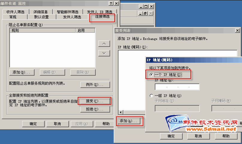 当RBL把你重要的合作伙伴服务器的IP被RBL列入,可以在“全部接收和拒绝列表”的“接受”中增加对方的IP地址,从而实现直接的放行。