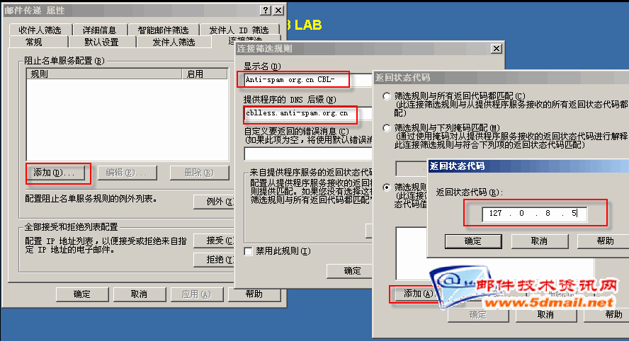 阻止名单服务就是我们平常所说的实时IP黑名单(RBL),Exchange Server提供管理员增加可信的RBL,从而可以有效的过滤已知的垃圾邮件发送者的IP。我们建议使用以下三个RBL。