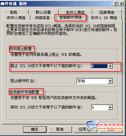 6)在垃圾邮件存储配置中设定设定需要阻止的邮件SCL值