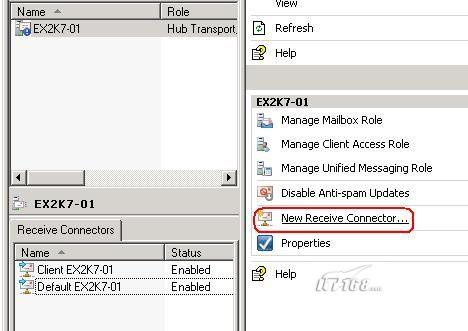 2、 定位到Server Configuration---Hub Transport,点击New Receive Connector,如图1所示,