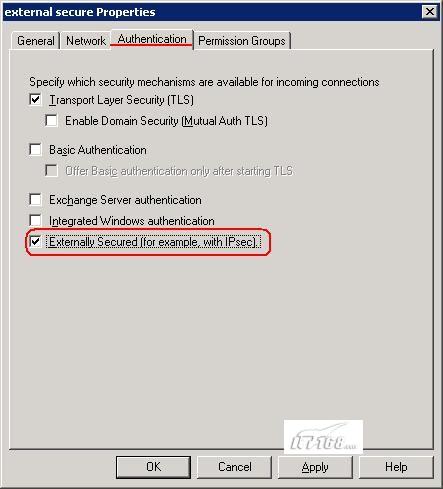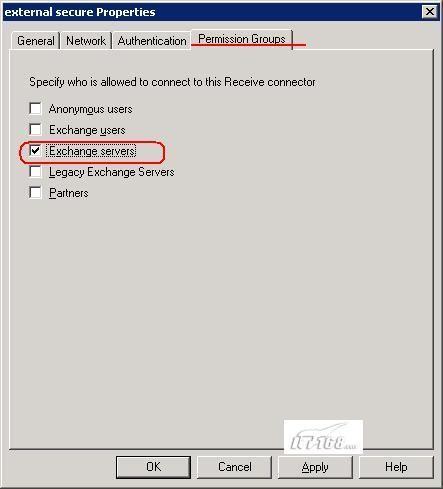 当您选中ExternalAuthoritative认证机制的时候,Exchange Servers权限组是必须的。该认证机制和权限组的组合将下面的权限授予接收连接器上的任何进入连接: