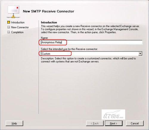 3、 The New SMTP Receive Connector 的向导将会启动,在Name 中输入名称,在Select the intended use for this connector 中选择Custom,如图2所示,