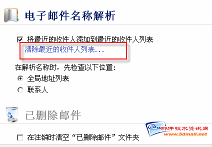 登录OWA后,请打开“选项”,找到“邮件”选项页的“电子邮件名称解析”,你将看到下面“清除最近收件人列表”的选项(如下图),单击它即可清除自动完成的列表。
