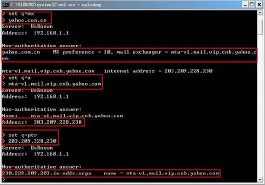 上图是一个服务器的正确解析结果。即能够从yahoo.com.cn的域名解析到其mx记录为mta-v1.mail.vip.cnb.yahoo.com,进而解析到其A记录203.209.228.230,那么发往该域的信件都会发送到此地址了。如果欲发送地址域名解析不正确,那么也就无法发送成功。