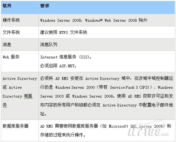 下表介绍了运行具有 AD RMS 服务器角色的基于 Windows Server 2008 服务器的软件要求。对于通过启用操作系统上的功能可以满足的要求,可通过安装 AD RMS 服务器角色根据需要配置这些功能。