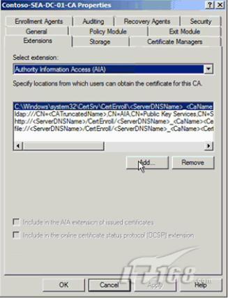 我们将选择AIA扩展然后增加一个用户能够从那里获得该CA的证书的位置。如图32所示。