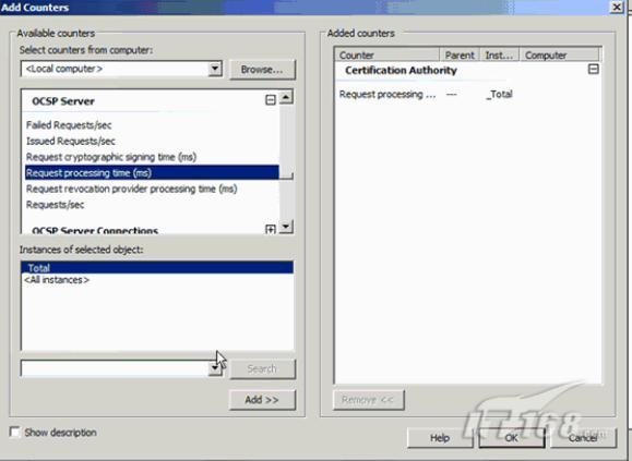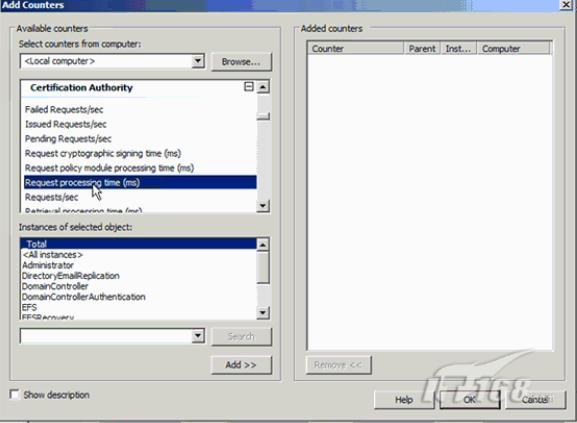 缺省的监视器显示了当前的处理器使用。在我们的演示中不需要它。要增加一个性能监视器,我们点击工具栏中的Add Counter按钮。可用的计数器列表将显示操作系统中所有可用的计数器。今天我们要关注的是关于证书服务的。