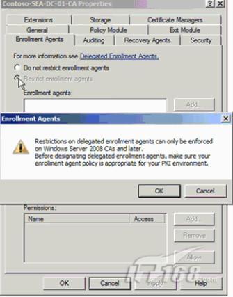注册代理部分允许限制某个域中某个指定的注册代理。这些能够被增加或删除从Enrollment Agents 栏中。当您限制注册代理,一个警告消息出现,它提示委派注册代理上的限制只能够在Windows Server 2008和后续版本中的CA上强制生效。在设计委派注册代理之前,确认您的注册代理策略是适用您的PKI环境。