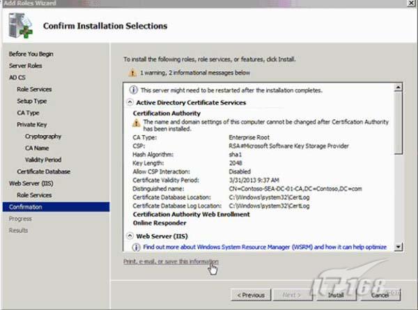 为了回顾该角色的安装选项的小结,我们可以点击打印、e-mail 或保存该链接。这将打开一个Windows Internet Explorer 窗口来现实所有的信息。如图12所示。