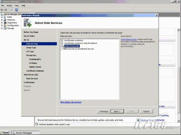 Windows Server 2008包含添加角色向导。添加角色向导不仅可以用来安装角色,它也包含角色的配置。为了让角色正常工作而必须被执行的关键配置任务是向导的一部分。展现在添加角色向导中的所有的配置在缺省情况下是安全的,对IT专家来说有默认的智能优化。我们第一步是要打开服务器管理器。服务器管理器显示所有不同的角色从细节方面。目前,活动目录域服务和DNS服务器角色被配置。我们今天要添加的是证书服务。首先我们需要添加IIS角色。