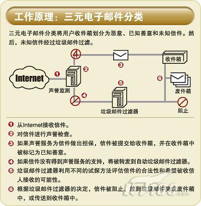 采用三元分类法后,最佳信件将绕过垃圾邮件过滤器,只有没有得到声誉服务支持的信件或普通信件,接受自动的垃圾邮件过滤。通过过滤器的信件将出现在收件箱中,不加任何特殊的标记。信任图标被保留给已知的、善意的、享有良好声誉的电子邮件(它们都绕过过滤器)。