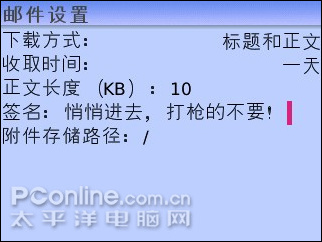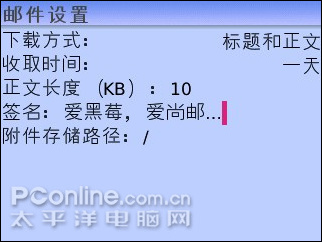 在“签名”一栏,输入你想要设定的签名。我的BB之前设定的是“爱黑莓,爱尚邮…”,现在想换成“悄悄进去,打枪的不要!”嘿嘿~